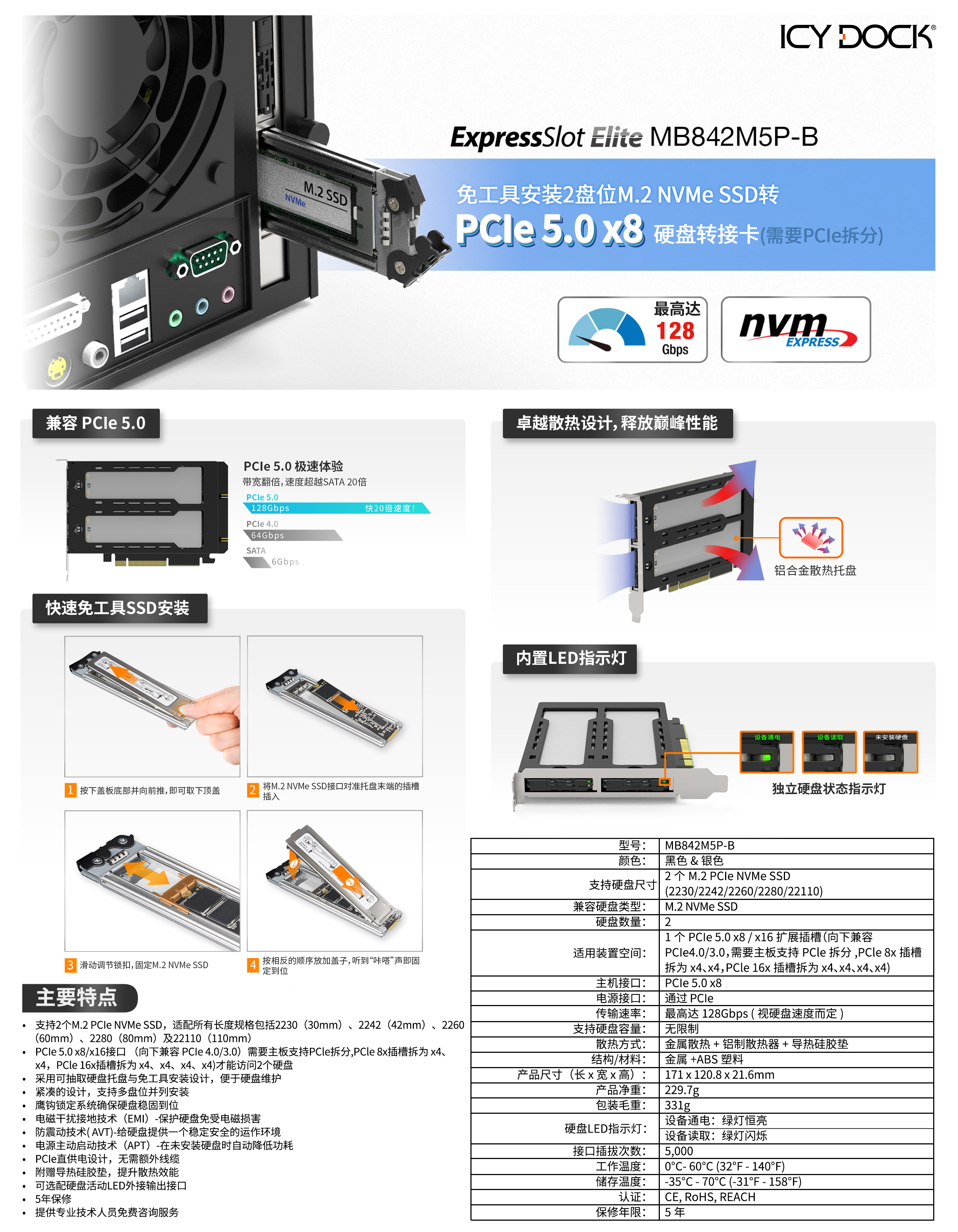 | 支持硬盘尺寸: | 2个M.2 PCIe NVMe SSD (2230/2242/2260/2280/22110) |