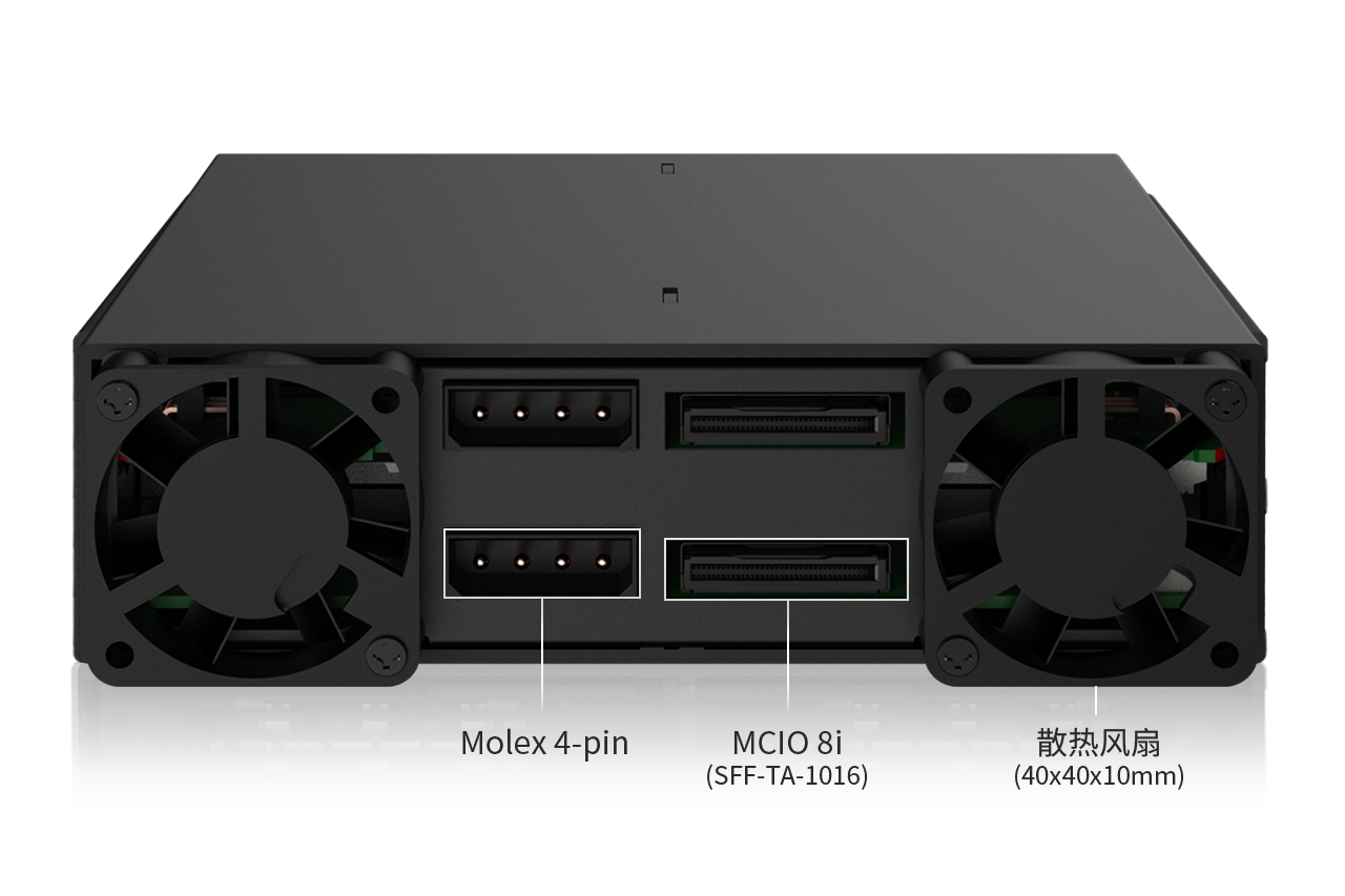 | 主机接口: | 2× MCIO 8i(SFF-TA-1016),引脚定义符合 SFF-9402 Rev 1.1标准(兼容三模式HBA/RAID卡) |