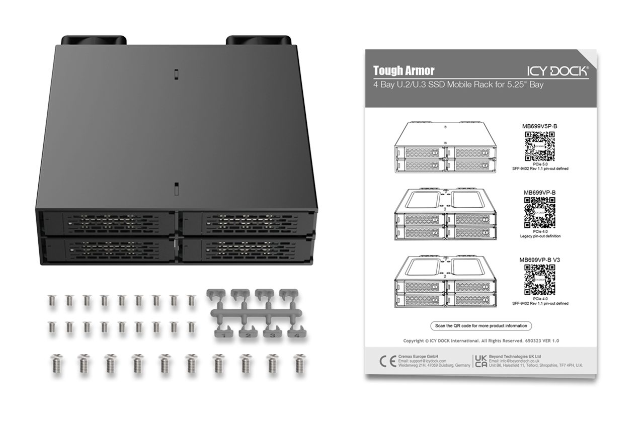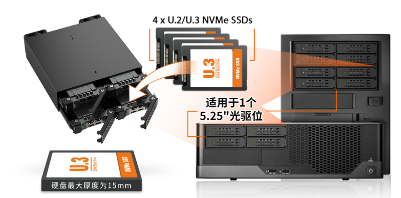 | • | 可在单个标准5.25英寸光驱位中安装4个U.2/U.3 NVMe SSD(厚度7–15mm) |