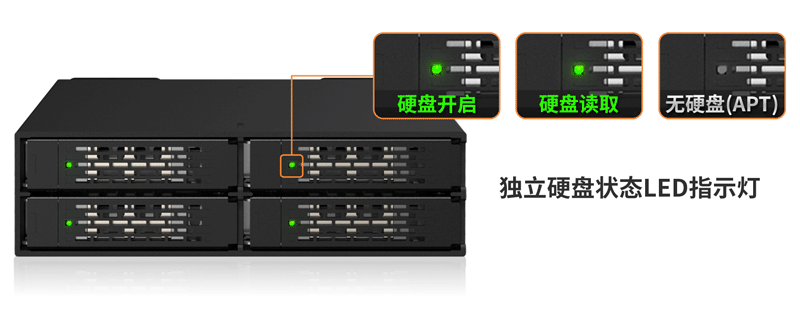 | 硬盘LED指示灯: | 硬盘通电:常亮绿色; 硬盘访问:闪烁绿色 |