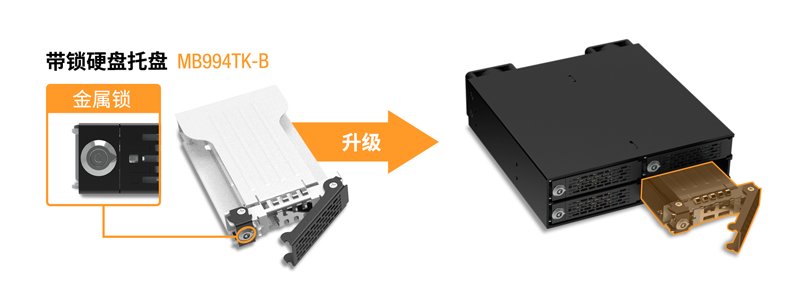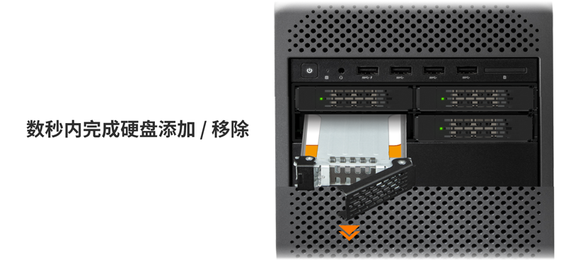 | • | 鹰钩式托架锁扣,将硬盘托盘稳固固定在机箱内部 |