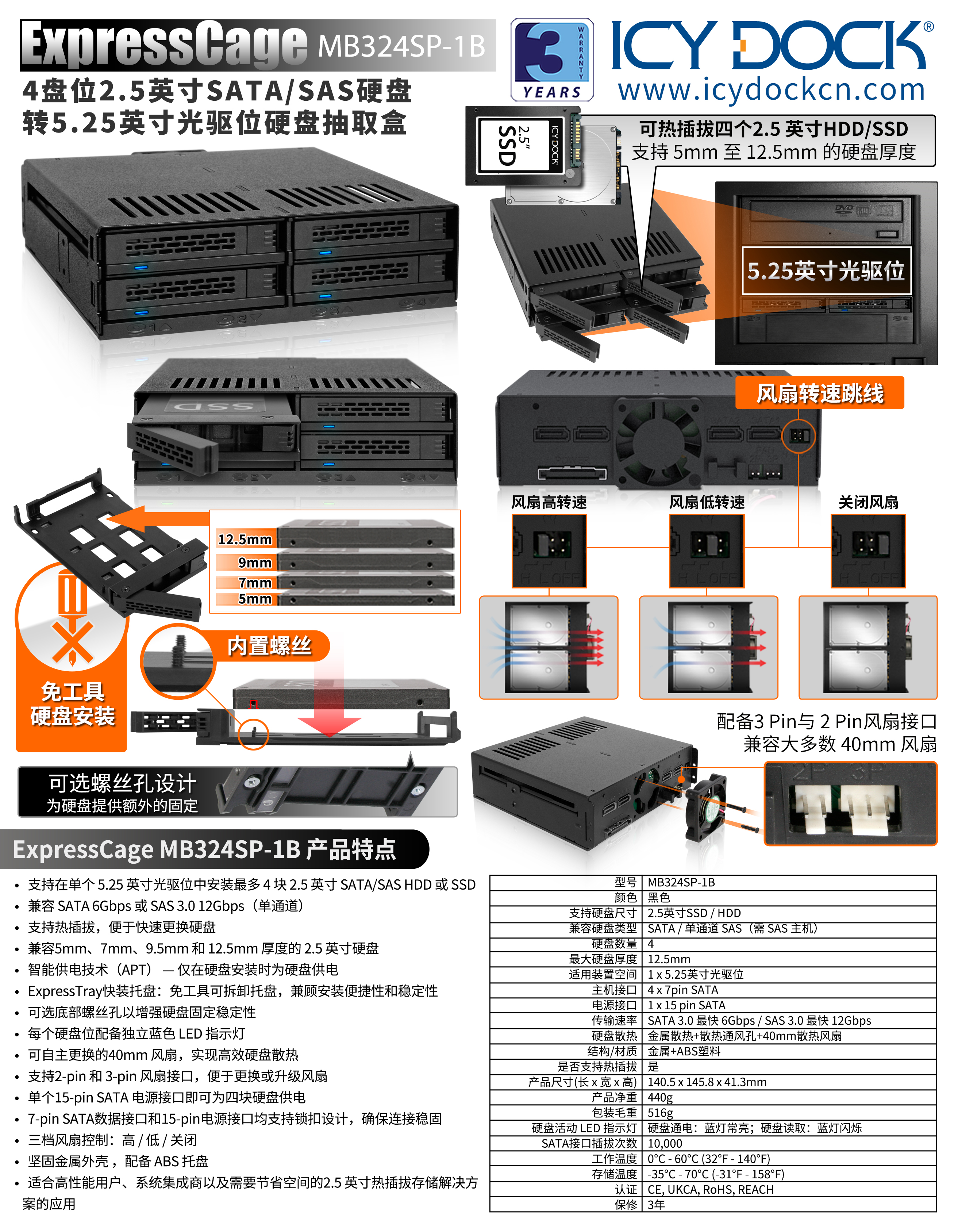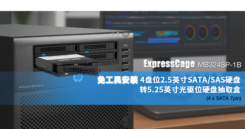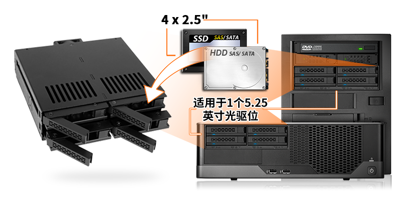 | • | 支持在单个 5.25 英寸光驱位中安装最多 4 块 2.5 英寸 SATA/SAS HDD 或 SSD |