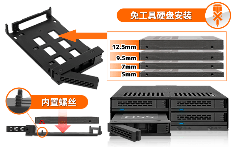| • | 兼容5mm、7mm、9.5mm 和 12.5mm 厚度的 2.5 英寸硬盘 |