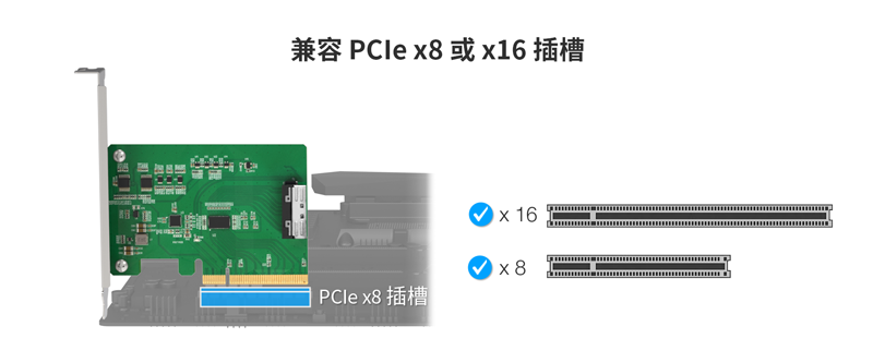 | • | 兼容PCIe 5.0/4.0/3.0/2.0(x8/x16 物理插槽) |
